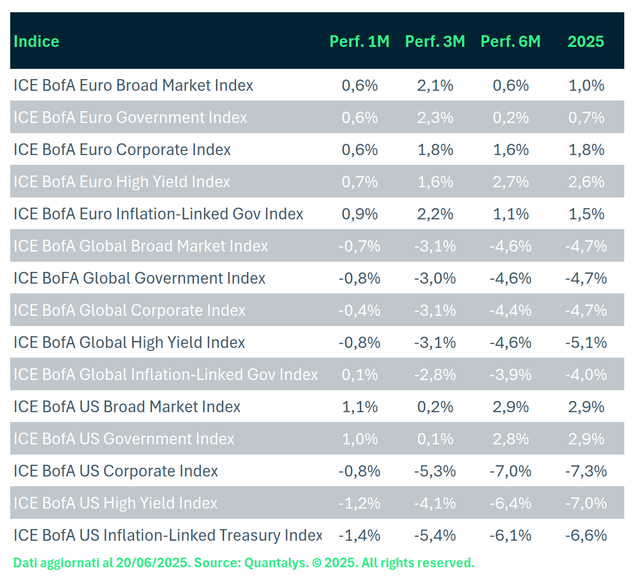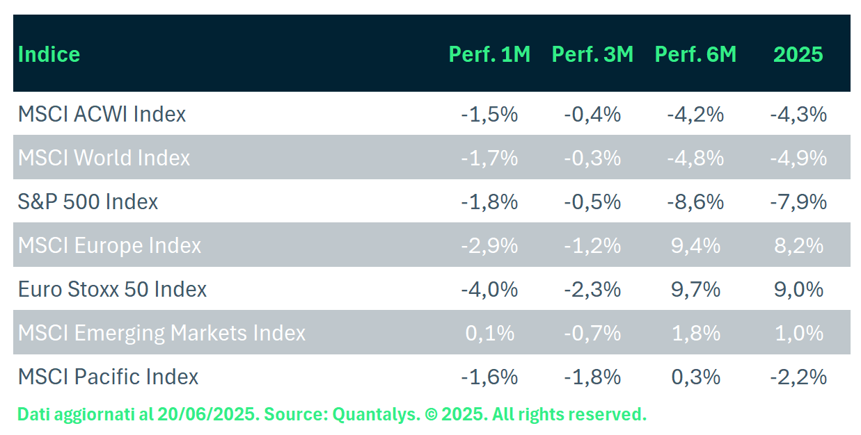 Momento di attesa per i mercati finanziari, tra l’interpretazione di quelli che possono essere gli sviluppi nel conflitto in corso tra Israele e Iran e le decisioni interne americane, tra Federal Reserve e Donald Trump. Dopo la forte volatilità tra marzo ed aprile, la fase di indecisione si rivela ora piuttosto marcata, con la questione tariffe commerciali momentaneamente offuscata dalle tensioni geopolitiche. Ne deriva un andamento mensile non pienamente definito, in termini di andamenti borsistici. S&P500 resta vicino ai 6.000 punti, senza movimenti al ribasso troppo marcati. L’Europa perde quota (-4,0%),