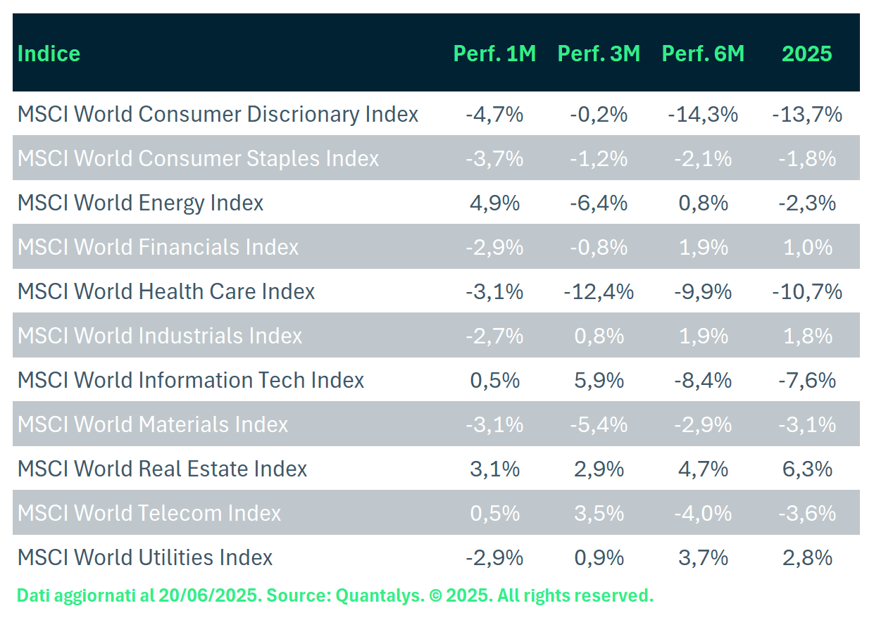Il rialzo del prezzo del petrolio, dopo la decisione OPEC di aumentare la produzione e in attesa di reazioni derivanti dagli scenari geopolitici ha per ora portato ad una spinta per il settore energetico (+4,9%). Continua il recupero del settore immobiliare (3,1%), il migliore da inizio anno (+6,3%). Poco mossi o deboli gli altri comparti a conferma di una non chiara direzionalità delle dinamiche settoriali.