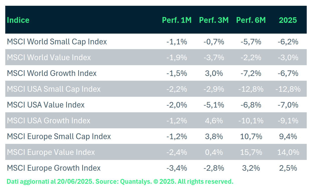 Il contesto favorevole di fine 2024 per le small cap, dettato dal ciclo economico in atto, che ha sostenuto le aziende a piccola capitalizzazione durante i primi mesi del 2025, dopo alcuni segnali di recupero, soprattutto in Europa è venuto a mancare: MSCI World small cap (-1,1%), MSCI USA small cap (-2,2%) e MSCI Europe small cap (-1,2%).