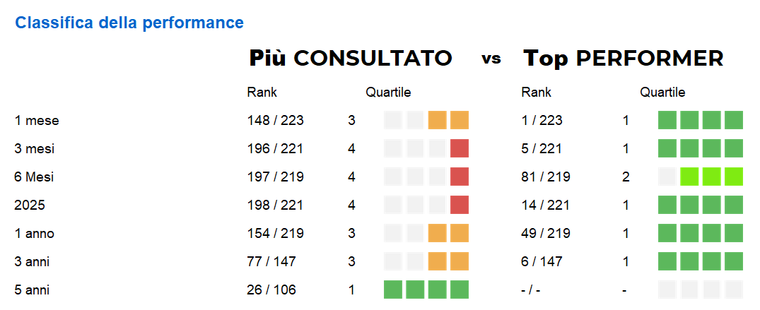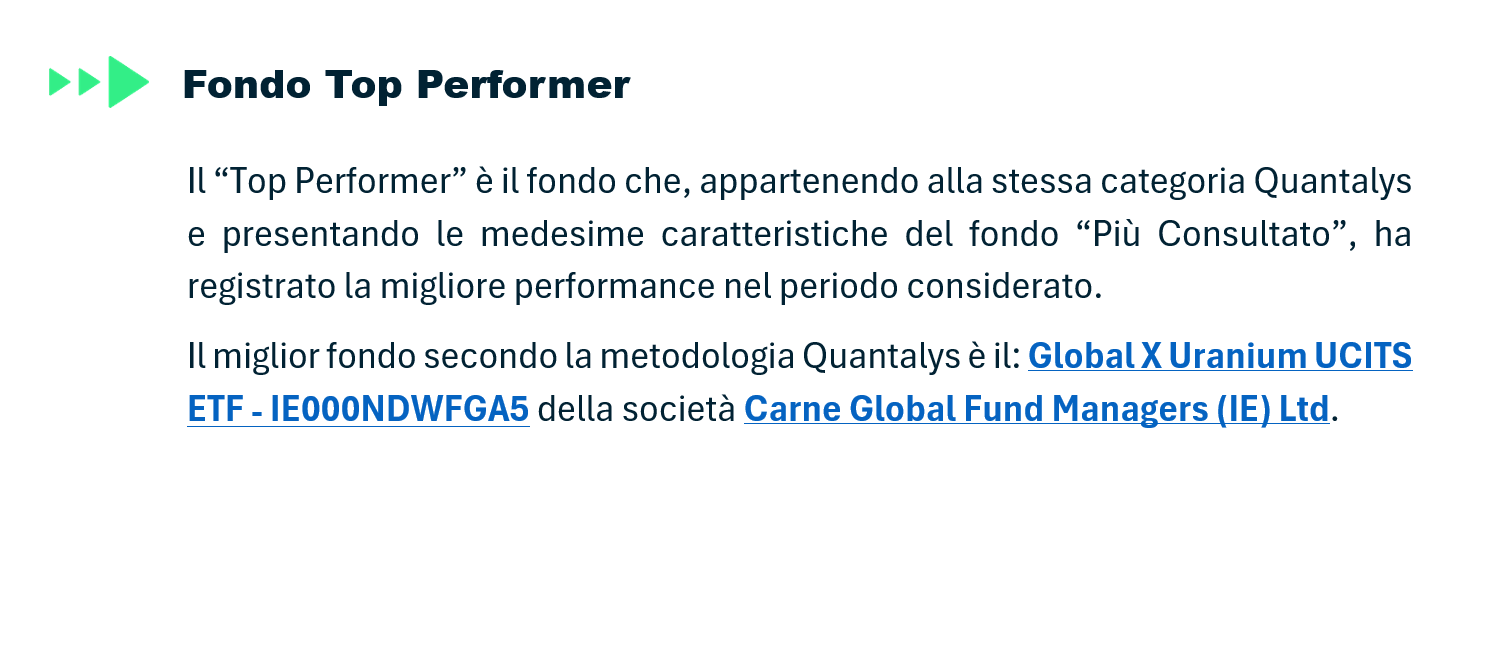 * La metodologia utilizzata per l'elaborazione dei dati è interna a Quantalys. I calcoli sono aggiornati al 31/05/2025. I calcoli sono effettuati da Quantalys e sono basati sui dati inviati giornalmente dalle società di gestione. Eventuali errori o omissioni sono di esclusiva responsabilità di Quantalys. Nonostante la massima cura prestata nella raccolta, nella verifica e nell’elaborazione dei dati provenienti da fonti ritenute affidabili, Quantalys non garantisce che i dati ricevuti siano accurati. Tutti i calcoli sono effettuati in euro.