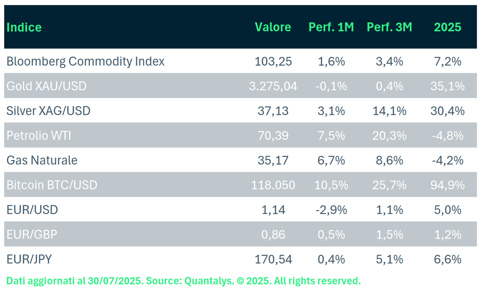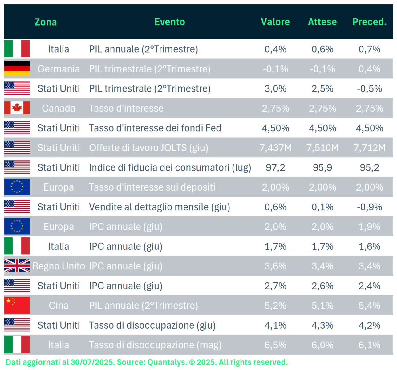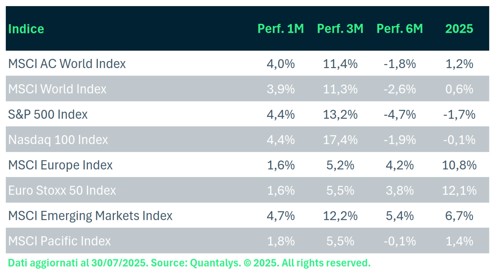 Il punto di Quantalys sui mercati: Arrivano i primi accordi tariffari tra gli Stati Uniti e le principali potenze economiche mondiali. Borse americane positive, restano indietro le borse europee ed emergenti. Banche centrali fermano la discesa dei tassi. Rendimenti dei titoli governativi stabili e dati macroeconomici in miglioramento.