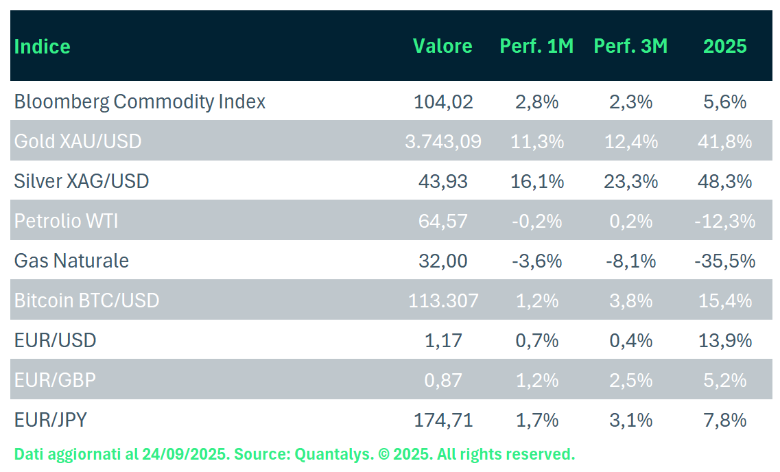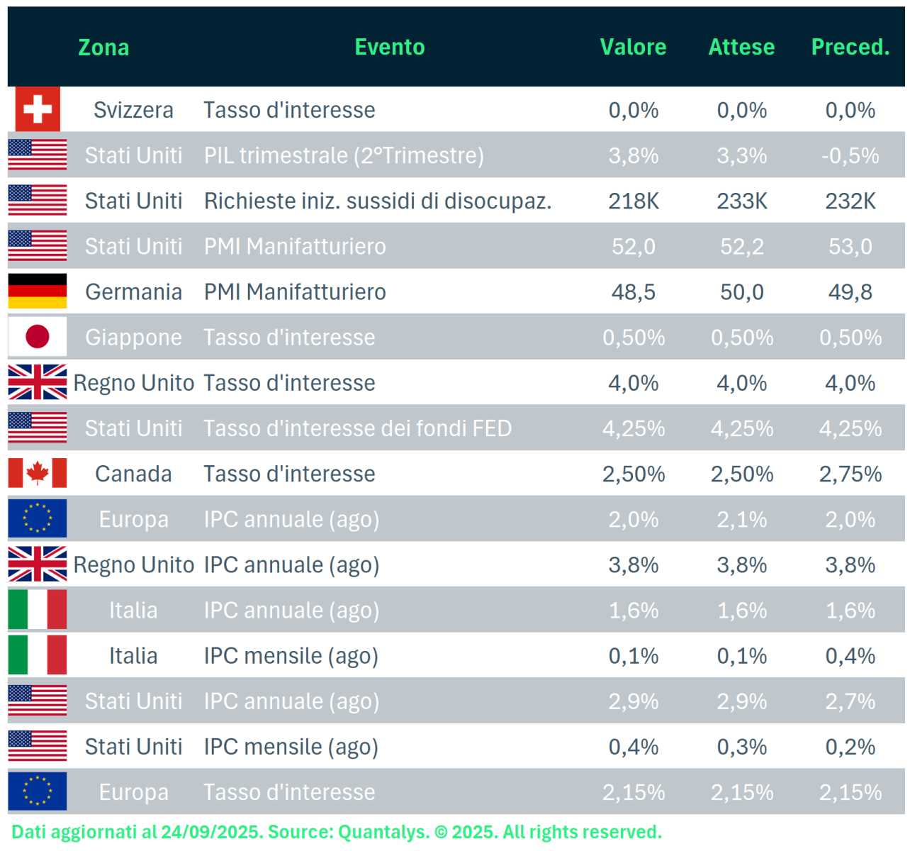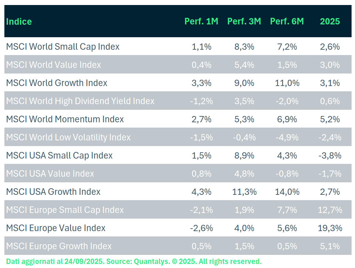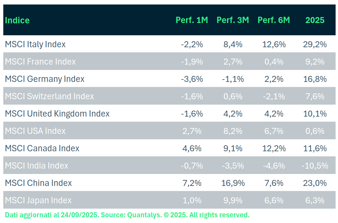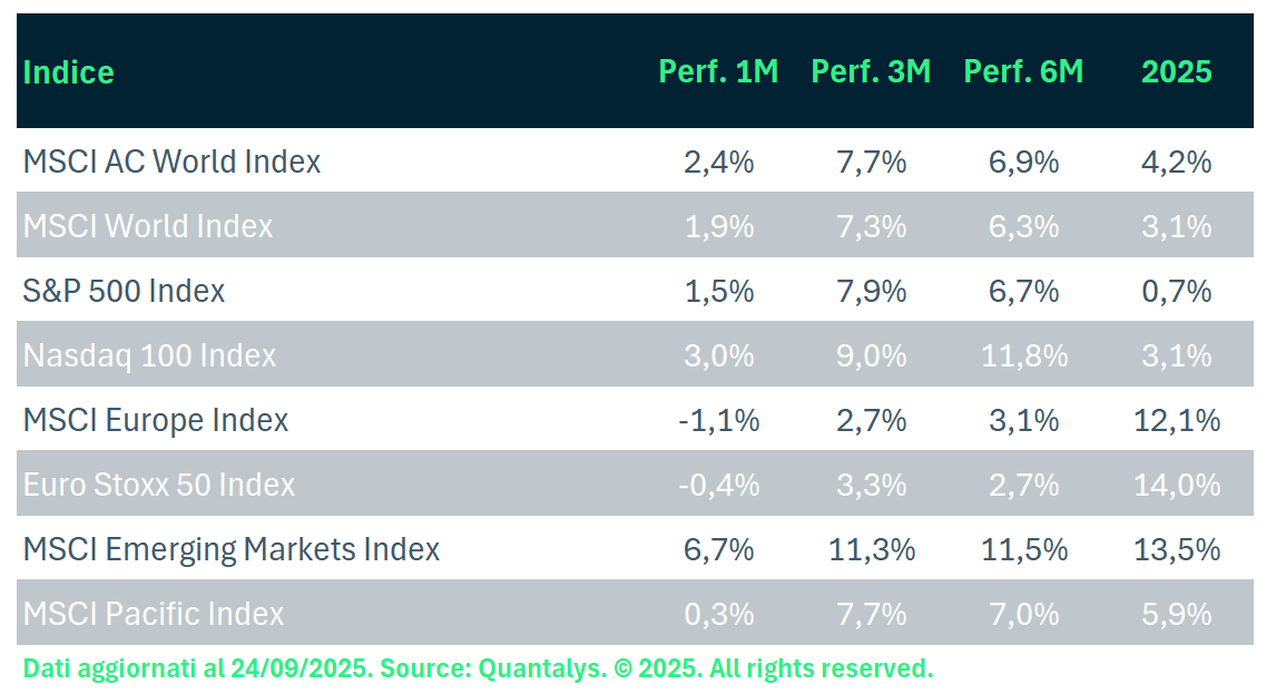 Il punto di Quantalys sui mercati: Continua la corsa dei titoli tech e delle borse americane. Il mercato del lavoro appare in moderato deterioramento, semaforo verde per la Fed, che taglia i tassi di 0,25 punti. L'Europa prova a seguire il movimento di Wall Street ma fatica. Intanto la geopolitica accelera: Israele alza il livello a Gaza, Trump cambia tono sull'Ucraina e l'India apre a Safran, evidenziando crepe nella cooperazione con Washington.