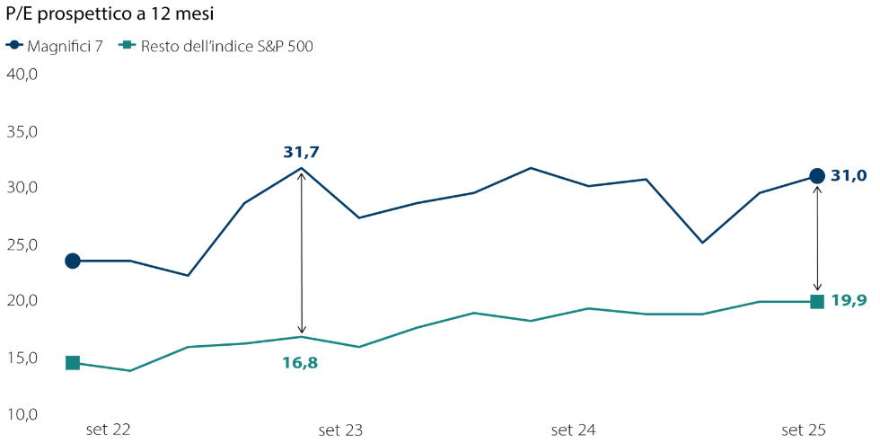 Fonte: FactSet. Il rapporto prezzo/utili (P/E) forward viene calcolato dividendo il prezzo delle azioni per le stime di consensus sugli utili a 12 mesi. Il rapporto P/E forward per i Magnifici 7 corrisponde alla media ponderata per la capitalizzazione di mercato. Dati al 30 settembre 2025.
