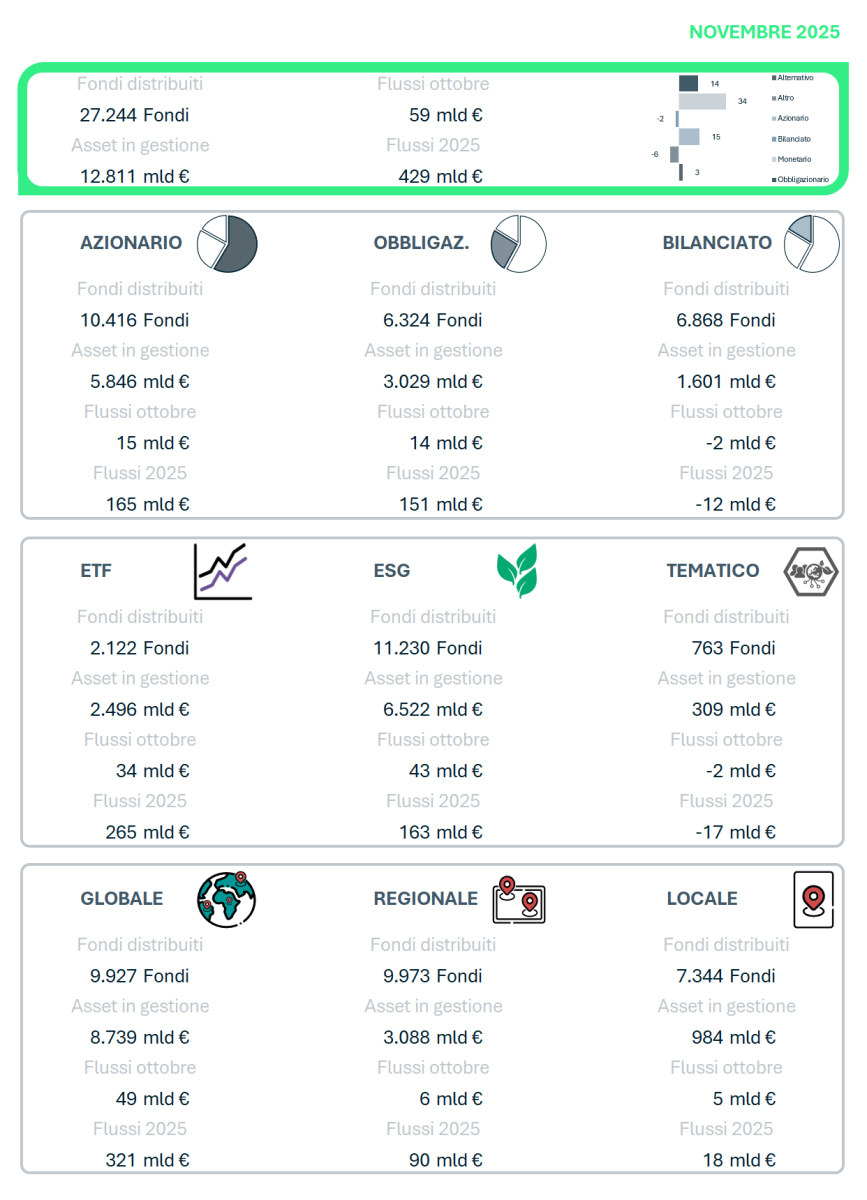 27.244 fondi distribuiti in Europa per un totale di 12.811 miliardi di Euro di masse gestite, scopri l'analisi mensile di novembre 2025 sull'andamento della Raccolta in Europa!