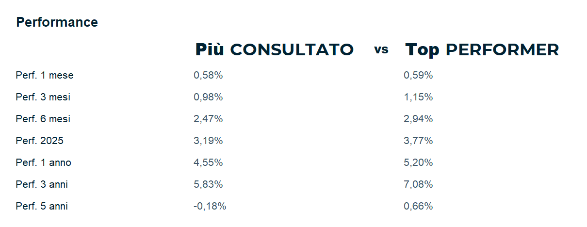 * La metodologia utilizzata per l'elaborazione dei dati è interna a Quantalys. I calcoli sono aggiornati al 31/10/2025. I calcoli sono effettuati da Quantalys e sono basati sui dati inviati giornalmente dalle società di gestione. Eventuali errori o omissioni sono di esclusiva responsabilità di Quantalys. Nonostante la massima cura prestata nella raccolta, nella verifica e nell’elaborazione dei dati provenienti da fonti ritenute affidabili, Quantalys non garantisce che i dati ricevuti siano accurati. Tutti i calcoli sono effettuati in euro.